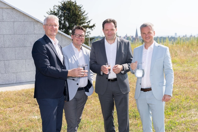 V. l. n. r.: ÖVGW-Vizepräsident Nikolaus Sauer, der Wiener Klimastadtrat Jürgen Czernohorszky, Wasserminister Norbert Totschnig und der Chef von Wiener Wasser, Paul Hellmeier, beim Wasserbehälter Schafberg in Wien © ÖVGW / Daniel Hinterramskogler