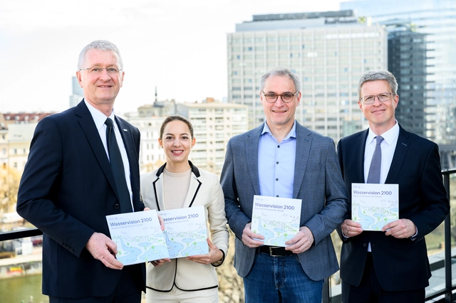 V. l. n. r.: Mag. Nikolaus Sauer (ÖVGW-Vizepräsident), DI Anna Selitsch (ÖVGW Bereichsleiterin Wasser), DI Dr. Daniel Resch (Geschäftsführer ÖWAV), Mag. Martin Niederhuber (ÖWAV-Präsident). © Max Slovencik